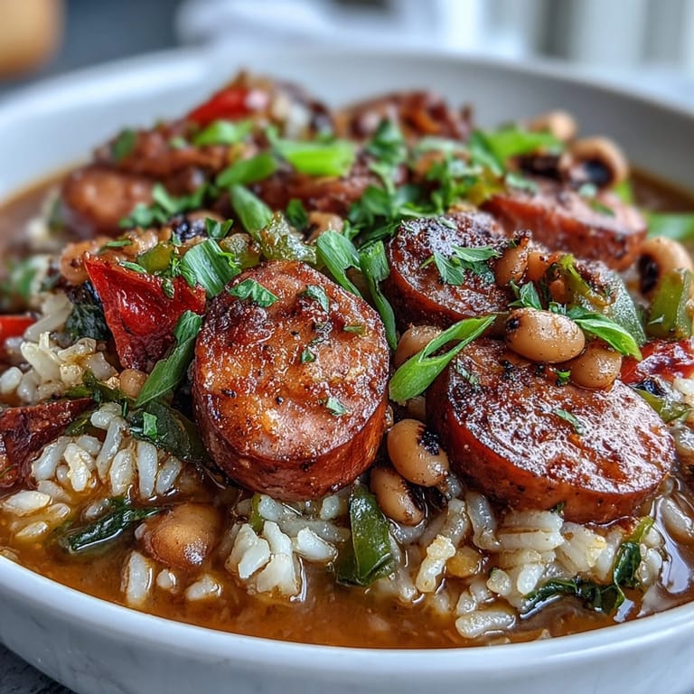 Merken Tauchen Sie ein in die reiche kulinarische Tradition des amerikanischen Südens mit unserem Black-Eyed Pea Jambalaya. Dieses herzhafte Eintopfgericht vereint die Seele der Cajun-Küche mit dem Komfort klassischer Südstaaten-Aromen. Die Kombination aus würziger Andouille-Wurst, nahrhaften schwarzen Augenbohnen und sämigem Reis erzählt eine Geschichte von kultureller Verschmelzung und kulinarischem Erbe.