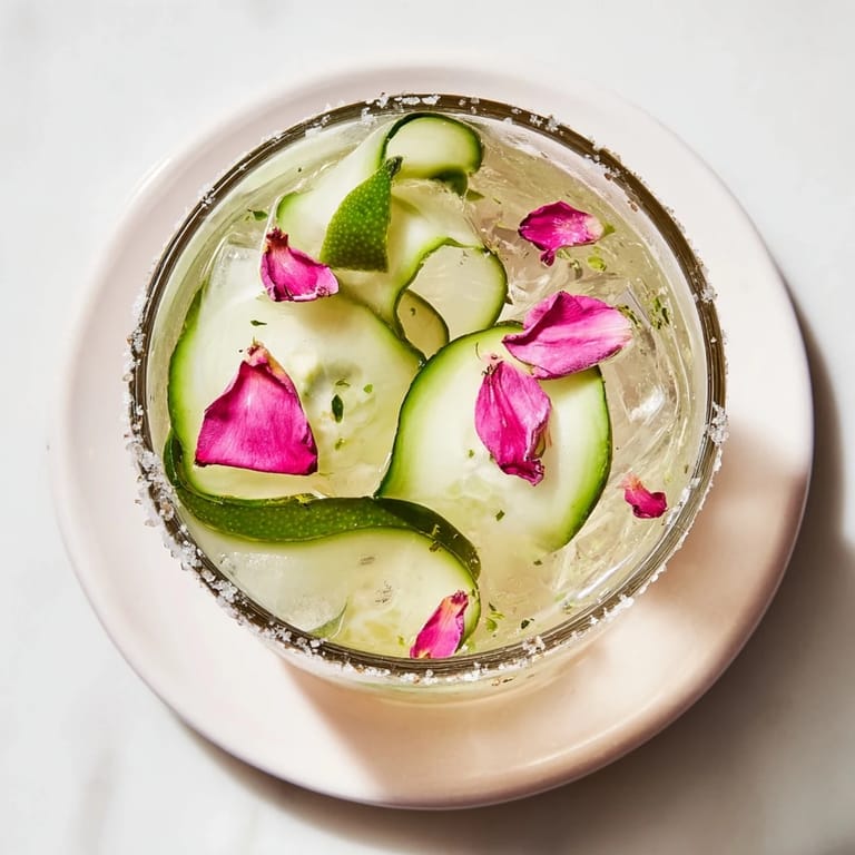 - Garnitur: Rosa essbare Rosenblätter (unbehandelt), dünne Gurkenbänder oder Scheiben, grobes Salz (für den Glasrand), Limettenspalten