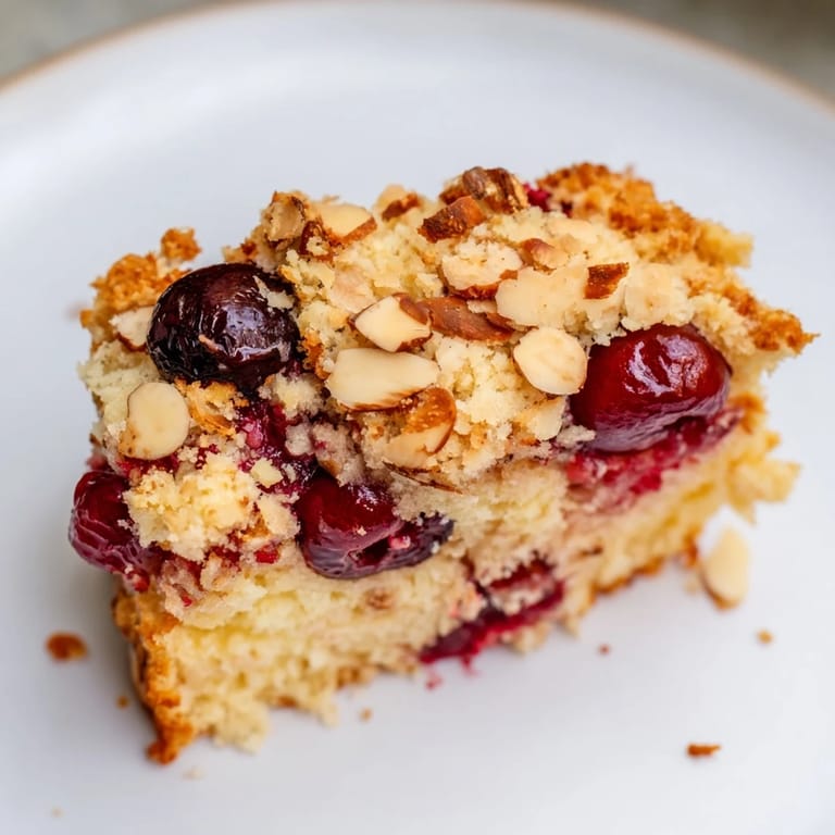 Merken Ein beliebter deutscher Kaffee Kuchen neu interpretiert mit einem leichten, luftigen Boden, saftigen Kirschen und einem knusprigen Mandelstreuseltopping, perfekt für jede Zusammenkunft.