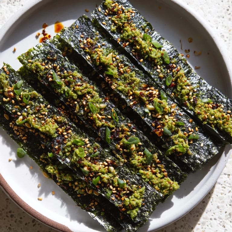 Die Nori-Blätter werden mit einer würzigen Öl-Mischung bestrichen und im Ofen bei niedriger Temperatur gebacken, bis sie trocken und knusprig sind.