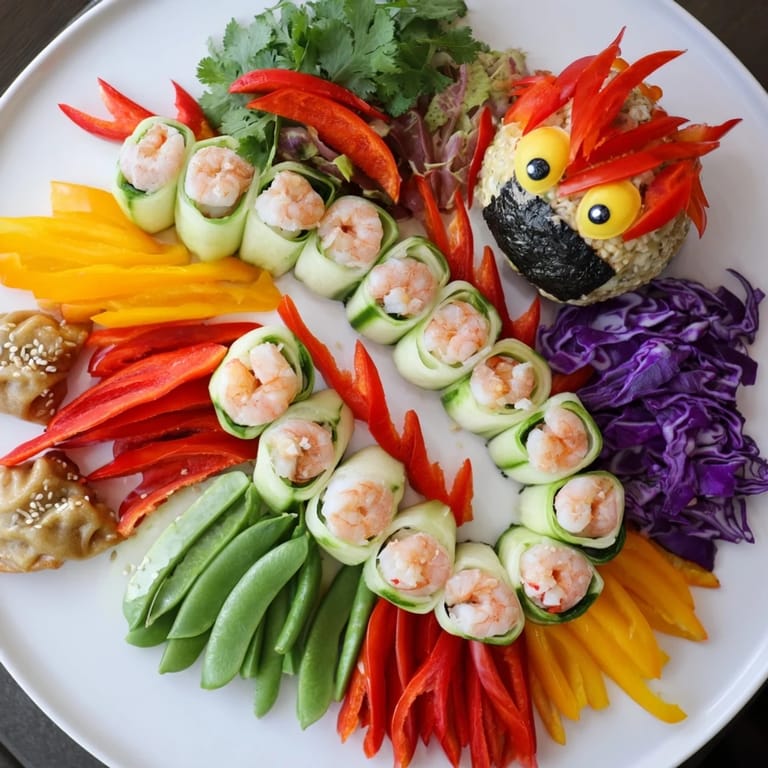 - Paprikastreifen, Zuckerschoten, lila Kohl, Karotten und Frühlingszwiebeln verwenden, um Flossen, Stacheln und den Schwanz des Drachens zu gestalten.