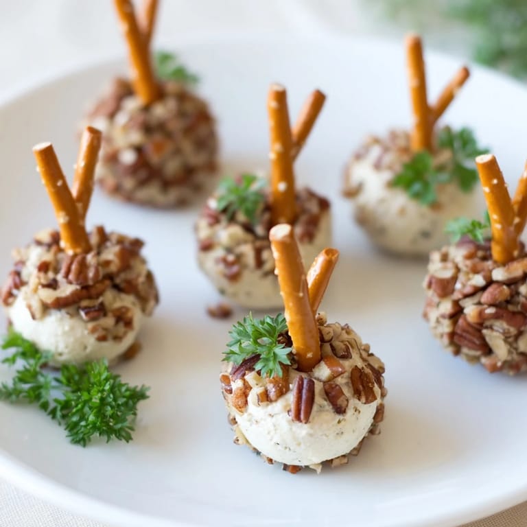 - Überzug & Dekoration: 60 g (1/2 Tasse) fein gehackte, geröstete Pekannüsse, 60 g (1/2 Tasse) fein gehackte Petersilie oder frischer Dill, 24 Mini-Salzstangen, 24 kleine Rosmarinblätter (optional, als Eichelstiele)