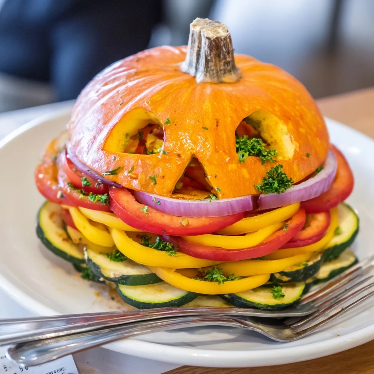 Merken Ein festliches und spaßiges Gericht mit geröstetem Kürbis und buntem Gemüse, arrangiert wie ein Jack-O-Laterne – perfekt für eine Halloween-Feier.
